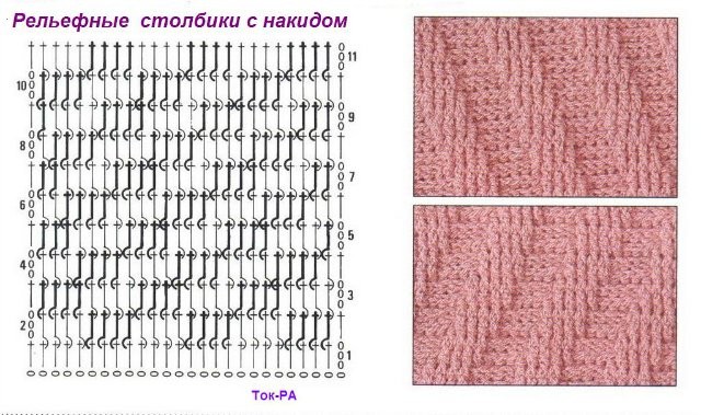 | Лицевой рельефный столбик с накидом | загнутый вправо (├) | Крючок вводится с лицевой стороны работы под ножку столбика предыдущего ряда — спереди назад и снова вперёд. |