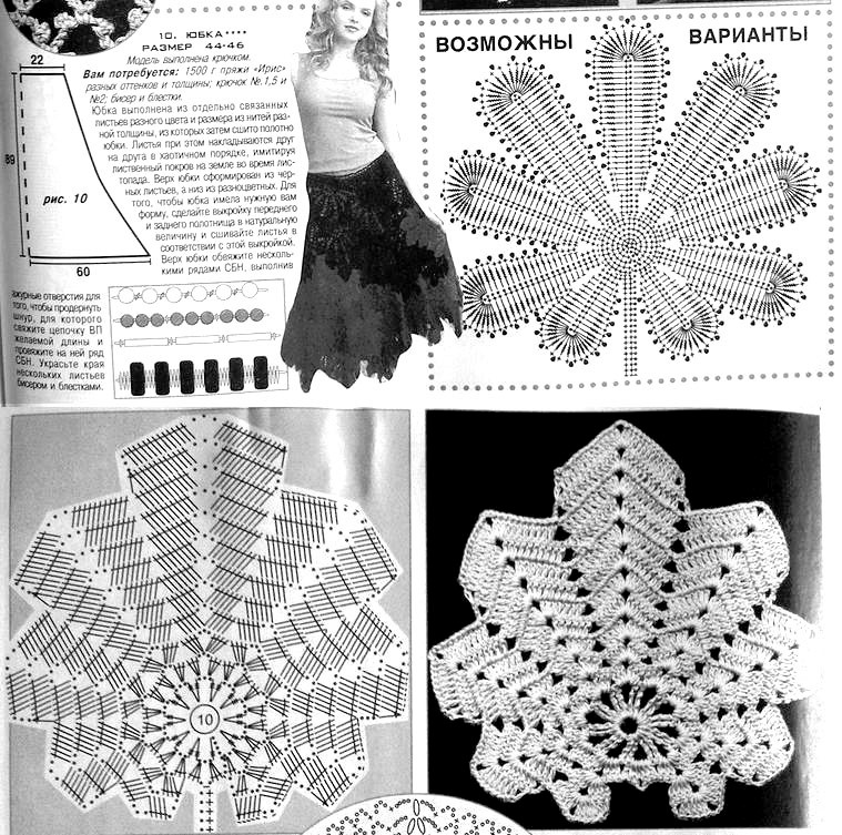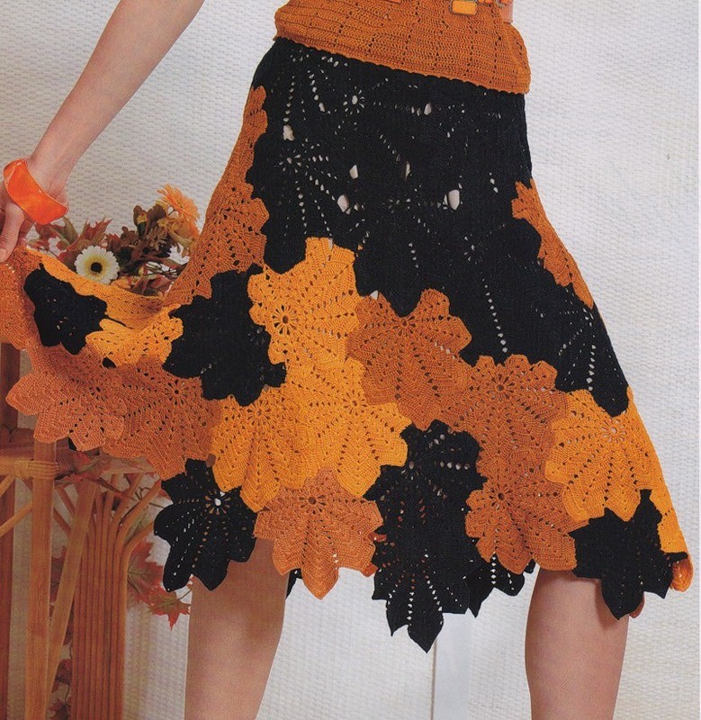 Для того чтобы получить листья разного размера провязывайте меньшее количество рядов. Связанные мотивы выкладывайте на выкройке, выполненной в натуральную величину лицевой стороной вверх (см. выкройку) составляя композицию. Сверху располагайте листья встык, а внизу, частично накладывая друг на друга. Наиболее приемлемое положение фиксируйте наметкой. Приметанные края листьев сшивайте нитками в тон мотивов. Для пояса по верхнему краю юбки провяжите 8 см С1Н. Затем перегните полотно на изнаночную сторону и пришейте. В пояс продерните резинку.