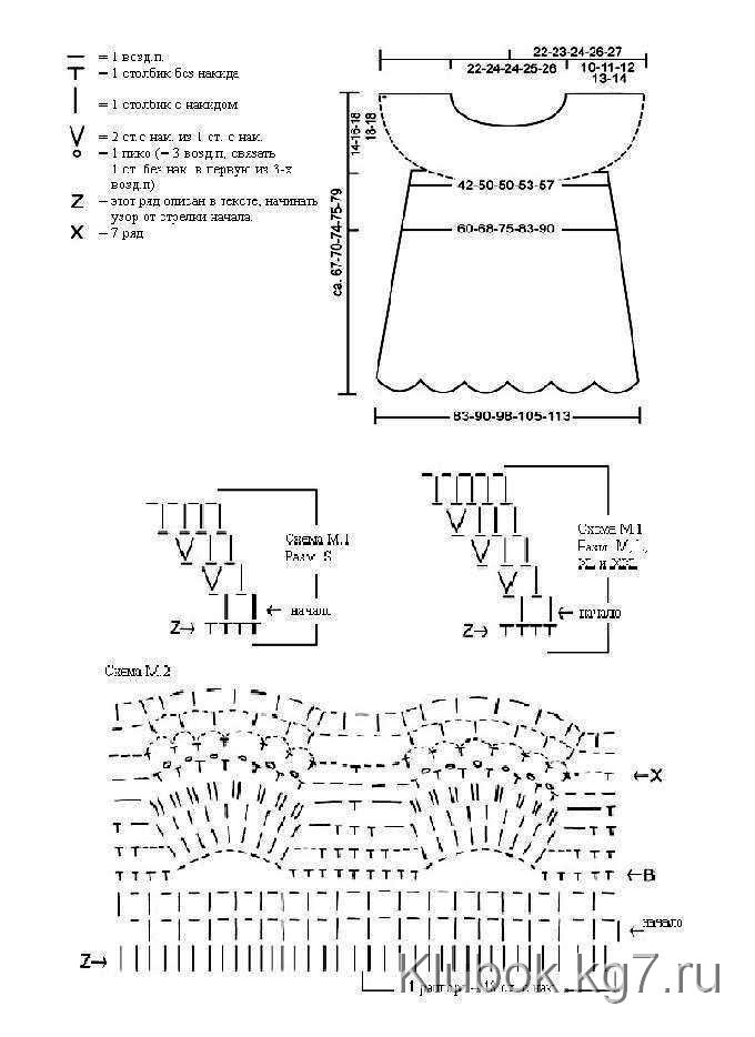Каждый ряд заканчивать 1 соед.п в 3/4-ю возд.п в начале ряда. Узор: см схемы М. 1 и М.2. Совет по измерению: на основании того, что пряжа тяжелая, все измерения длины делать на изделии в подвешен ом состоянии или туника получится слишком длинной.