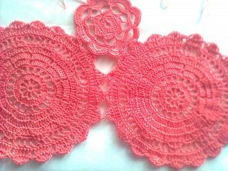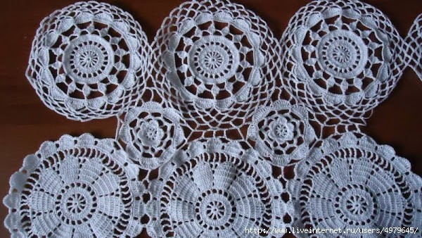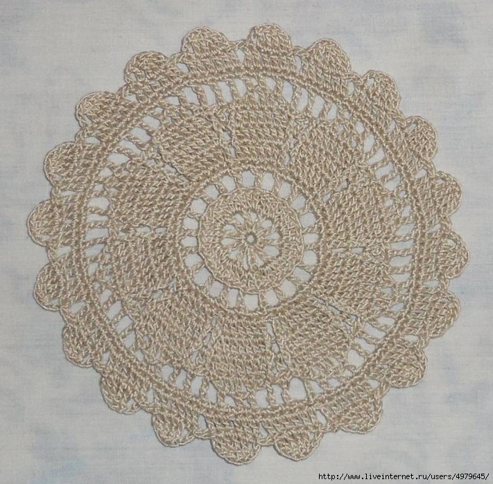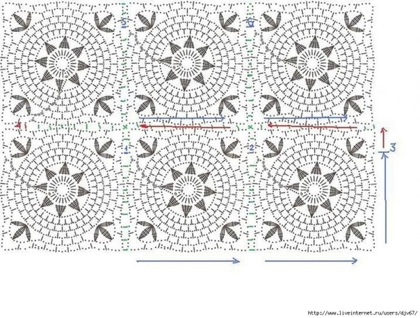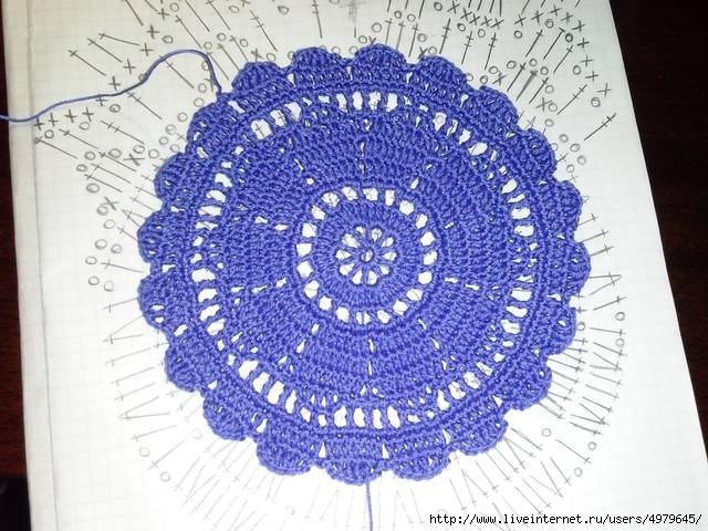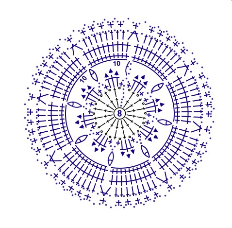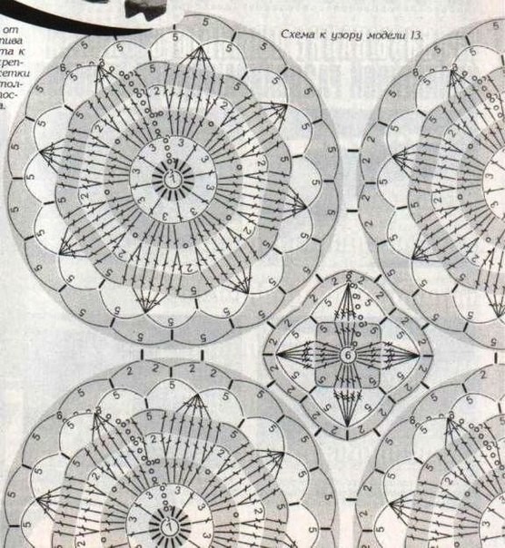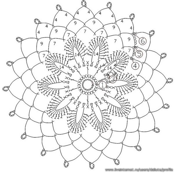 4й ряд: (вяжем во 2й ряд, т.о. получается внутренний цветок выпуклый) 4 в.п., 5 в.п., *1 ст. с 2 накидами, 5 в.п.* повторить 8 раз, 1 ст. с 2 накидами, 2 в.п., 1 ст. с накидом основанием между 4 в.п. и 5 в.п. начала ряда (т.о. получаем 10 арок и начало след. ряда в середине арки)