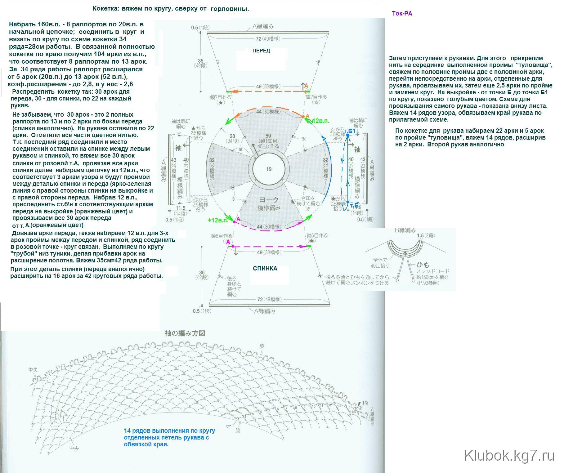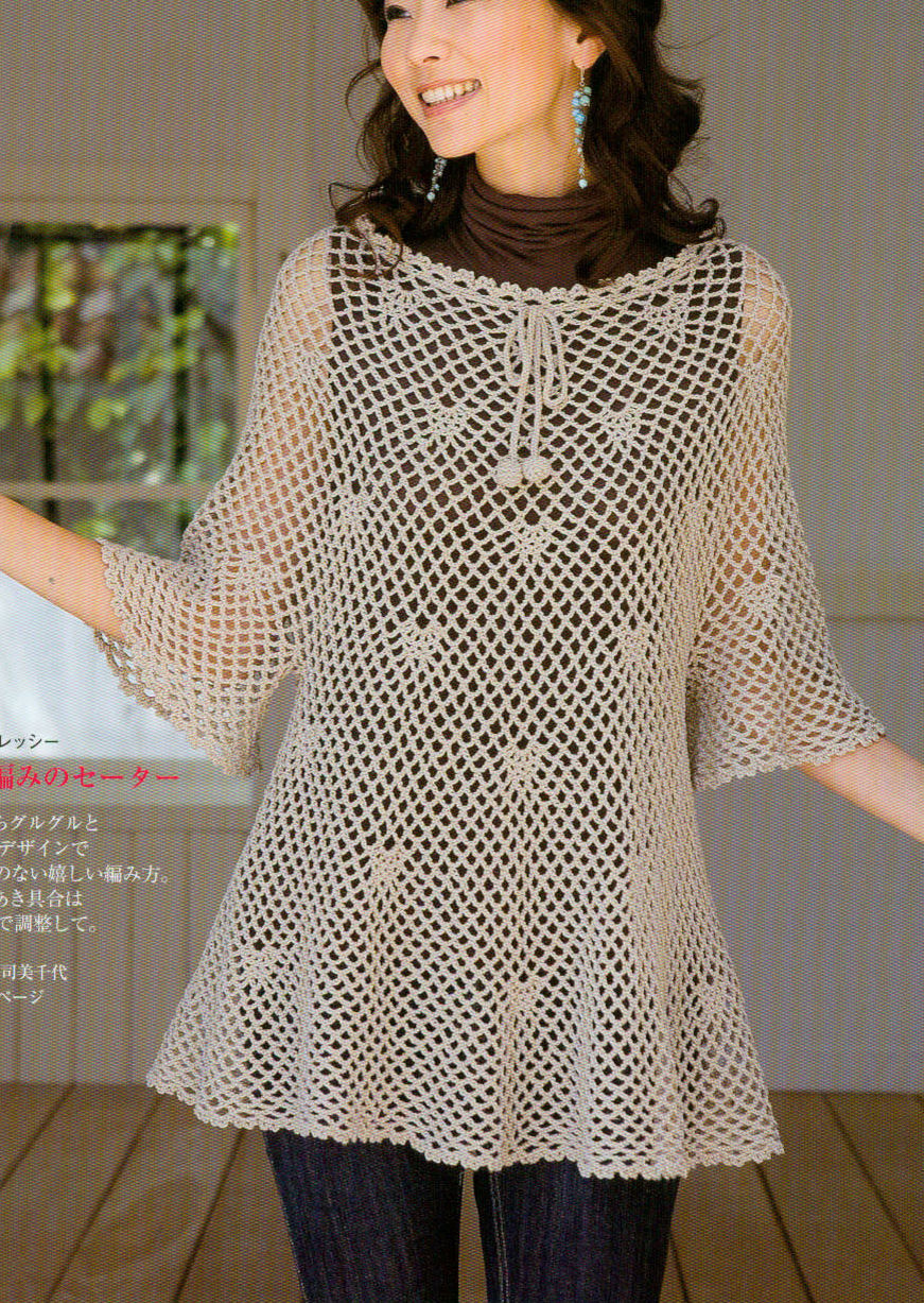 Сетчатая туника крючкомKlubokhttp://klubok.work/2/154/4857/Klubokhttps://klubok.work/css/image/top-logo-en.pngМодель: туника узором "сетка", расклешенная к низу, рукав 3/4, выполнен по типу удлиненного реглана. Круглая кокетка, выполненная сверху. Работа по кругу, без швов, одним полотном.