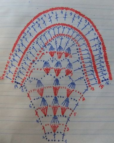 Автор схемы - Юлия Попова. Описание схемы от автора Вобщем начинаем с горловины, готовим столько мотков,сколько элементов вывяжем по окружности-это зависит от размера.и далее вывязываем первый элемент со всех мотков одновременно.он довольно простой схемы не прилагаю.замыкаем элементы в первый горизонтальный ряд.затем вывязываем второй ряд элементов в вертикальном направлении и третий, прикрепляем в процессе вывязывания к фестонам связанным из другого мотка.то есть когда заканчивается элемент одного ряда начинается элемент следующего ряда.вязать из каждого мотка нужно рдновременно по ряду.надеюсь вы поймете это описание) Фестоны соединяются змейкой из воздушных петель, 8ряд не довязывается заканчивается 3мя воздушными петлями, затем набираете 2накида один провязываете, еще набираете и со всеми столбиками провязываете, завершая ряд, вывязывая столбик из оставшегося на крючке накида.9ряд начинается 4мя столбиками из одной точки и т.д.В 15и17ряду ни каких воздушных перелек нет! Крестик это условное обозначение столбика без накида.В последнем ряду столбиков несколько с одним накидом, несколько с двумя недовязанных и просто с двумя.Легче вязать из отдельных элементов, присоединяя в процессе вывязывания горизонтальных рядов.но лучше нерегулярным вязанием-единым полотном.