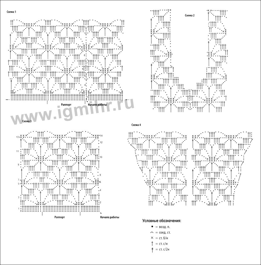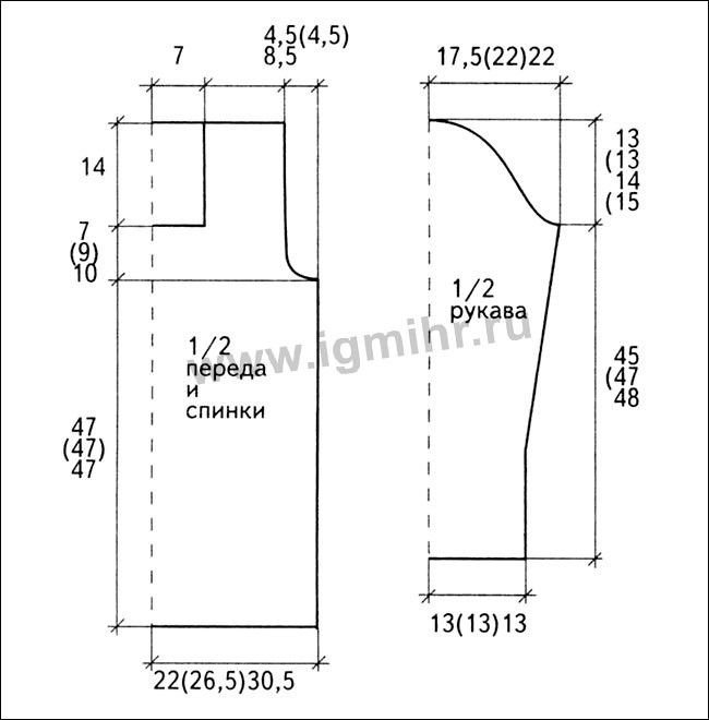 Перед и спинка: вяжите единым полотном. Наберите начальную цепочку из 230(276)322 возд. п. (длина цепочки примерно 88(106)122 см), замкните в кольцо соед. столбиком. Далее вяжите по кругу основным узором = 10(12)14 раппортов в ширину. В высоту провяжите 1 раз 1–10-й ряды, далее повторите 3–10-й ряды 4 раза, после этого провяжите еще раз 3–7-й ряды. Должно быть провязано 47 рядов, высота работы - примерно 47 см. Разделите работу на две части (перед и спинку) пополам и далее каждую часть вяжите отдельно.