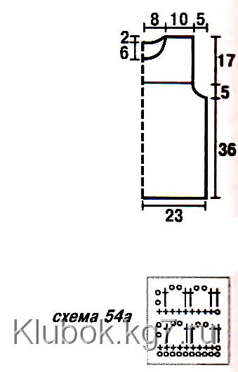 На детали кокетки расположите готовые элементы, приметайте их к бумаге и соедините иглой или крючком, выполняя бриды такой длины, чтобы вязание не стягивалось и не провисало. По краю детали проложите шнур-гусеницу и приметайте его. Пришейте соответствующие элементы к этому шнуру. Готовую деталь снимите с бумаги и обвяжите *С1Н,ВП* прикрепляясь к шнуру-гусеничке. Далее выполните обвязку гипюрным вязанием по схеме 54. Остальные детали свяжите узором по схеме 54 а, прикладывая вязание к выкройке. Обвяжите низ и проймы СБН. Сшейте боковые швы и пришейте кокетку. Пришейте пуговицы.