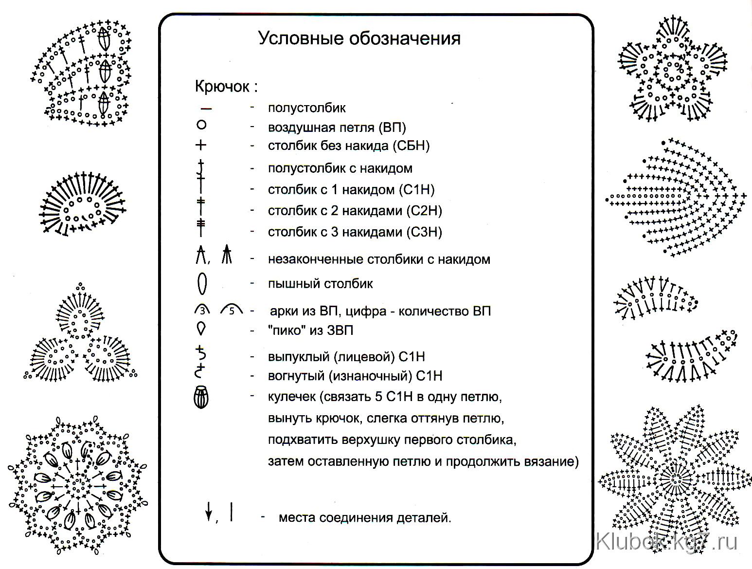 | Т | Полустолбик с накидом | Накид, вводите крючок, 3 петли на крючке — провязываются вместе. |