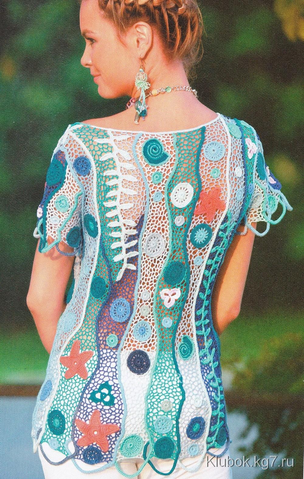 Заполните пространство между шнурами мотивами и сеткой. Спинка, перед и рукава в этом изделии выполняются в едином стиле, повторяя заданный рисунок.