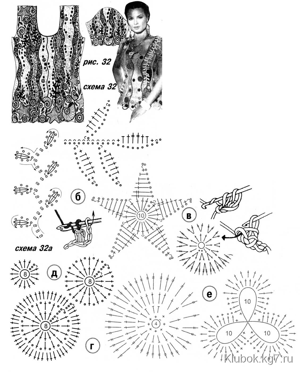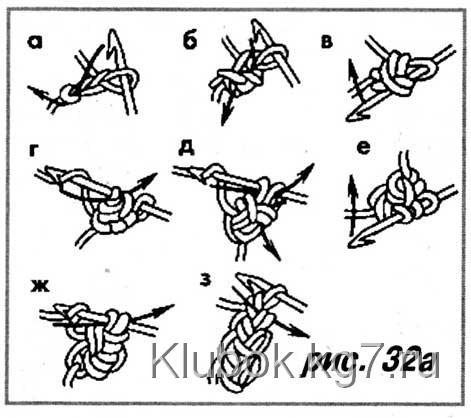 Вяжите из более толстой пряжи шнуры «гусенички» необходимой длины (рис.32 а). При выкладывании рисунка жестко крепите их на выкройке, приметывая частыми стежками. Скрепляйте их между собой с помощью иглы и катушечной нити в тон. Веточки, имитирующие морские водоросли, выполняйте по схемам 32, и 32 а. Мотивы, имитирующие морских обитателей, вяжите по схемам 32 б, 32 в, 32 г, 32 д, 32 е.