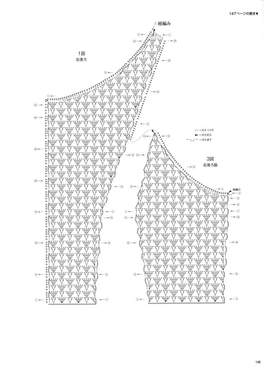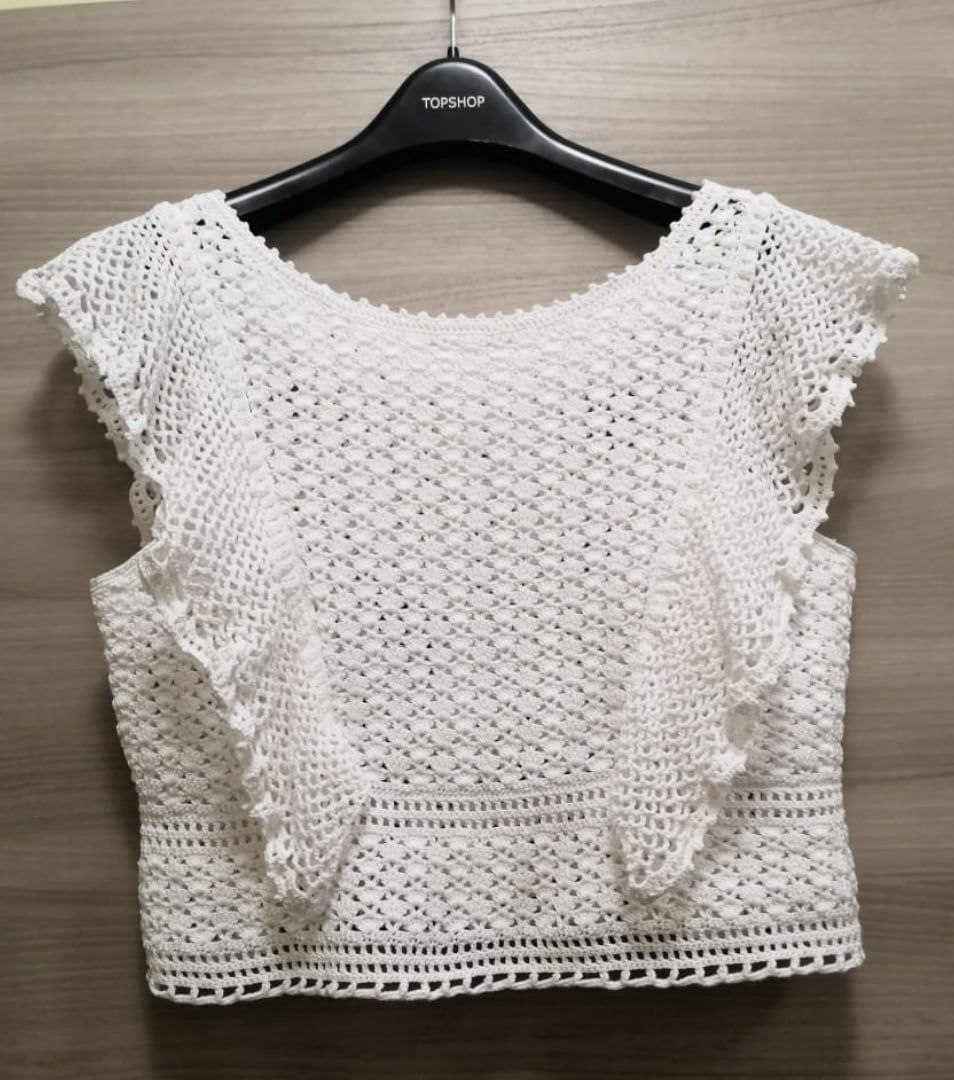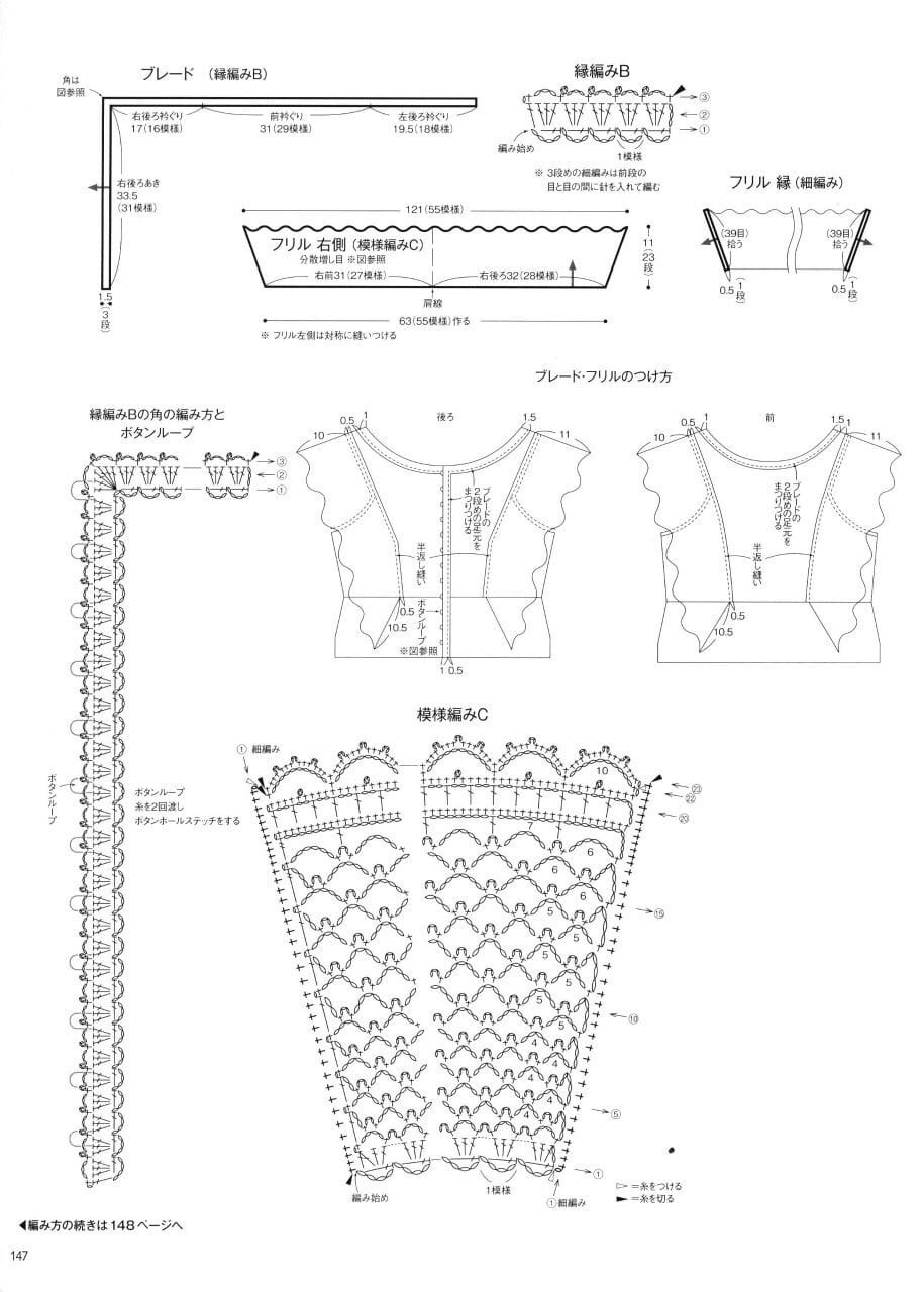 and the shoulders are joined with slip stitches. The frills are mainly made using front post double crochet and are attached to the shoulder ends.