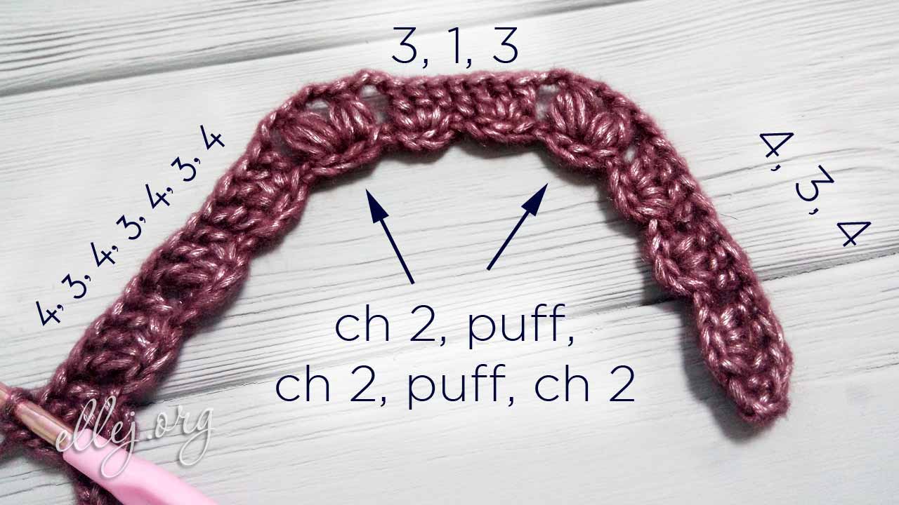 - Линия реглана (2 в.п., пышный столбик, 2 в.п., пышный столбик, 2 в.п.)