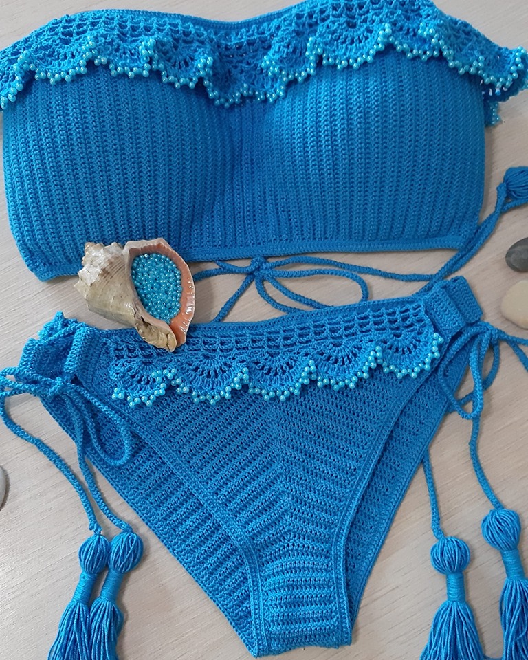 Depending on the thickness of the yarn and your size of the future swimsuit, the dense circle without holes can be increased or decreased. You can also crochet as many rows with holes as you deem necessary.