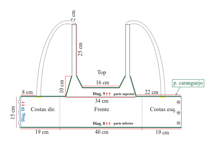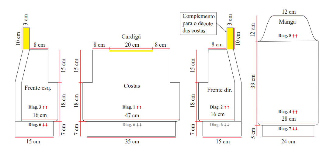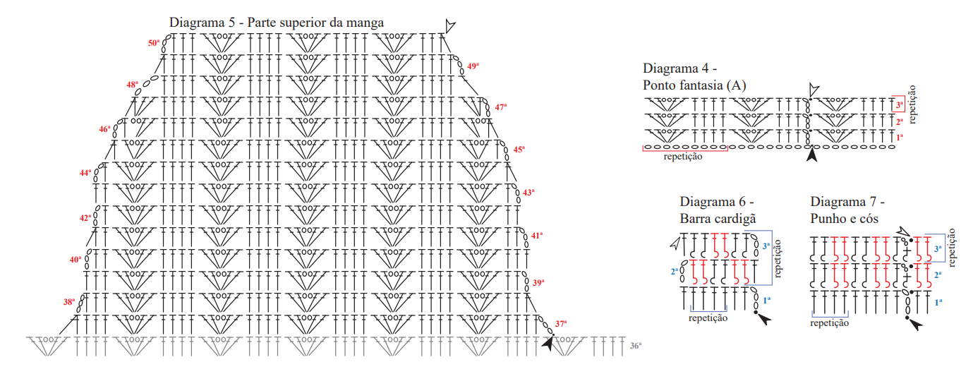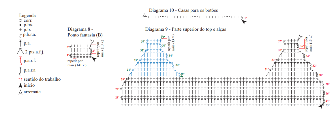 Используемые петли в крючке: corr.: воздушная петля, p.bx.: соединительный столбик, p.b.: столбик без накида, p.b.r.a.: ст. б/н рельефный, вводя сзади петли предыдущего ряда, p.a.: столбик с накидом, 2 pts.a.f.j.: 2 ст. с/н закрытые вместе в разных петлях основания, p.a.r.f.: ст. с/н рельефный, вводя спереди петли предыдущего ряда, p.a.r.a.: ст. с/н рельефный, вводя сзади петли предыдущего ряда, p. caranguejo: это ст. б/н выполненный слева направо, спинка: следуйте схеме 1, правая полочка: следуйте схеме 2, левая полочка: следуйте схеме 3, узор (A): следуйте схеме 4, верхняя часть рукава: следуйте схеме 5, нижняя планка кардигана: следуйте схеме 6; манжет и пояс: следуйте схеме 7, узор (B): следуйте схеме 8, верхняя часть топа и бретели: следуйте схеме 9, петля для пуговиц: следуйте схеме 10.