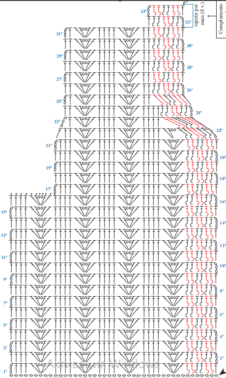Сокращения: acomp.: сопровождая, ag.: игла, carr.: ряд, diag.: схема, dir.: правая, esq.: левая, mot.: мотивы, nov.: мотки, p.: петля, pts.: петли, rep.: повторение или повторения, rem.: завершить, seg.: следующий, trab.: работать, работанный или работающий, v: раз.