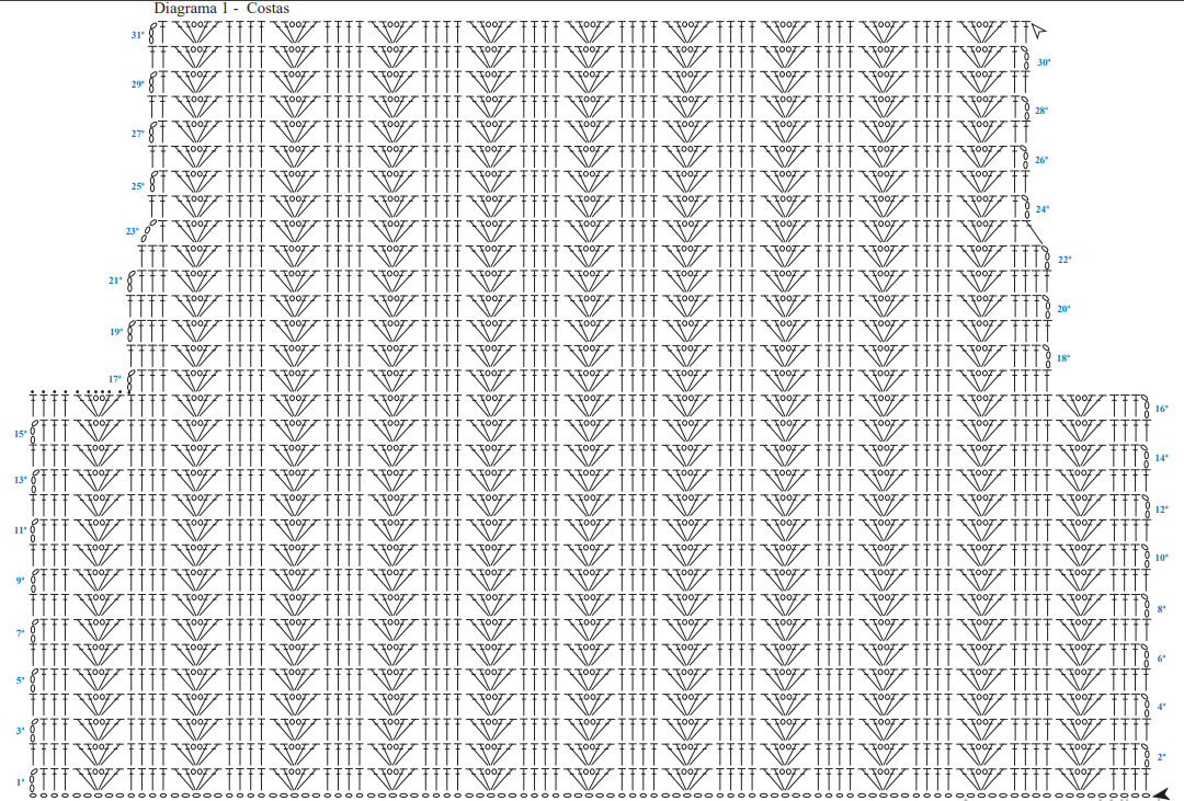 Кардиган – спинка: используйте крючок 2,5 мм, начните изделие снизу и работайте рядами туда-обратно. Сделайте цепочку из 103 возд. п., на этой цепочке работайте по схеме 1 с 1-го по 31-й ряд. Завершите нить и отложите изделие.
