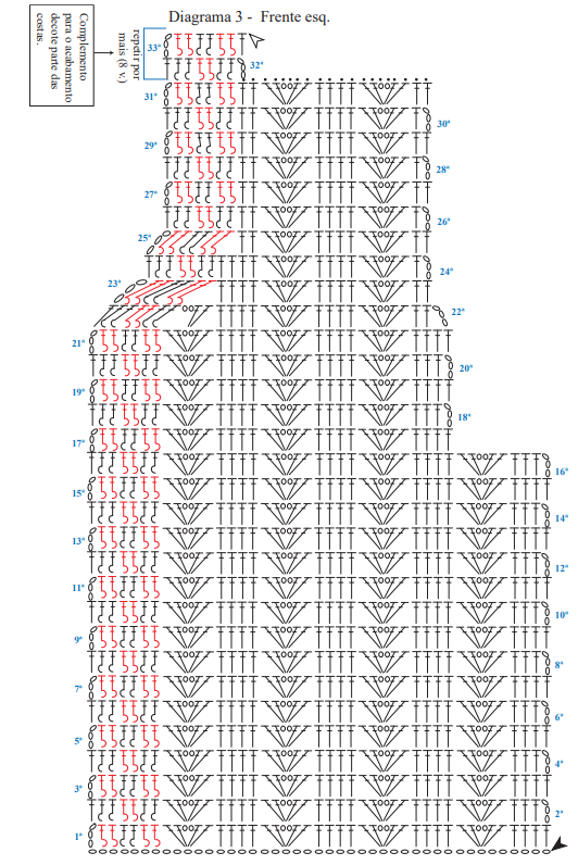 Левая полочка: используйте крючок 2,5 мм, начните снизу и работайте рядами туда-обратно. Сделайте цепочку из 43 возд. п., на этой цепочке работайте по схеме 3 с 1-го по 49-й ряд. Примечание: с 32-го по 49-й ряд формируется полоса дополнения для обработки выреза горловины спинки. Завершите нить и отложите изделие.