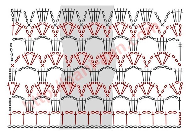 Ряды, которые на схеме нарисованы красным цветом: столбики с накидом вяжутся под арочку, столбики без накида — в третий столбик в группе из четырех столбиков с накидом (на макро-фото можно узор по петелькам-столбика рассмотреть). Почему в третий? Подобрала экспериментально из соображений симметрии.