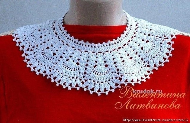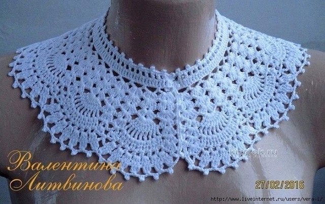 Ажурный воротник крючком. Работа Валентины Литвиновой Ажурные кружева, связанные крючком, никогда не выходят из моды. По изящным узорам видно, какие чувства хотела донести Вам мастерица: любовь, тепло, нежность, уют… Настоящий воротничок связан крючком из 100% турецкого хлопка. Особенно красиво смотрится на детских и женских платьях. С помощью таких очаровательных воротничков можно создать любой образ: классический, романтический или экстравагантный. Описание воротника Материалы: пряжа «Ирис» (100% х/б), 30 г белой; крючок № 0,9. Описание работы: набрать цепочку из 124 в. н. (121 в. п. основы + 3 в. п. подъема). 1-й р.: 1 ст. с/н в 5-ю в. п. цепочки от крючка, 119 ст. с/н в следующие 119 в. п. основания цепочки от крючка. 2-й р.: 7 в. п. (1 в. п. подъёма + 6 в. п.), * 1 ст. б/н в 4-й ст. с/н предыдущею ряда от крючка*, повторить от * до * 28 раз, всего 30 раз. Далее работу продолжить прямыми и обратными рядами согласно схеме по 10-й ряд включительно. Готовый воротник увлажнить, растянуть по размеру и оставить до высыхания.