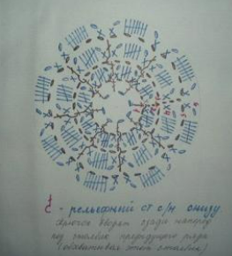 2 ряд – в каждую арку круга сделать ст. б/н, 1 в.п., 3 ст. с/н, 1 в.п., ст. б/н.