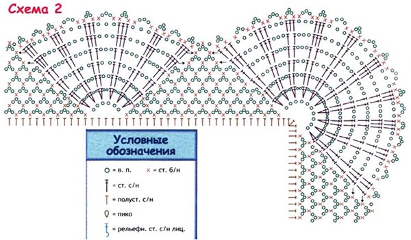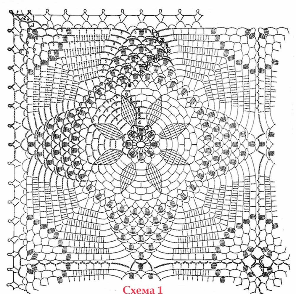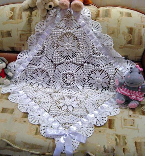 Для вязания этого пледа подойдет крючок № 1,5-2,5 и хлопчатобумажные нитки. Свяжите по схеме 1 – 4 мотива, соедините их вместе. Весь плед обвязать 1 р.: *3 ст. с/ 4 накидами, 1 в. п.*, повторять от * до * до конца ряда. В уголках вязать 3 раза из 1 п. нижнего р. 3 ст. с/4н. Выполнить 1 р. полуст. с/н, закрыть соед. ст. и продолжить вязание кружевом схеме 2. Продеть ленточку по периметру плед и завязать бантом.