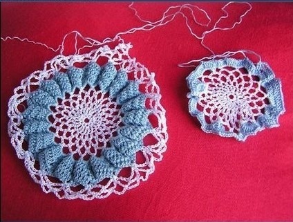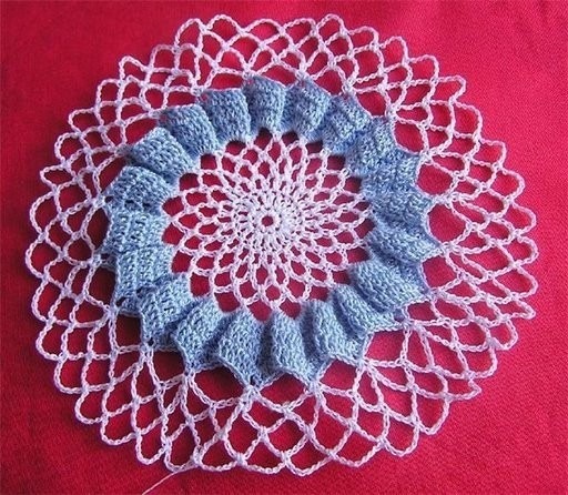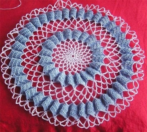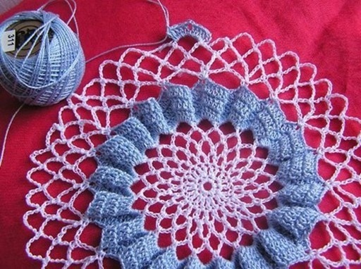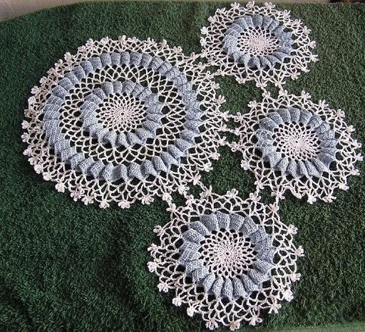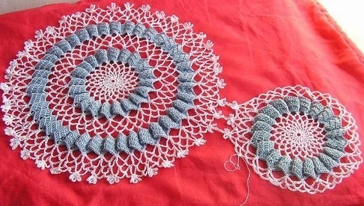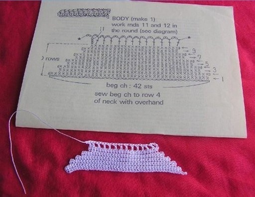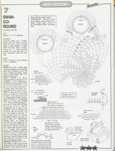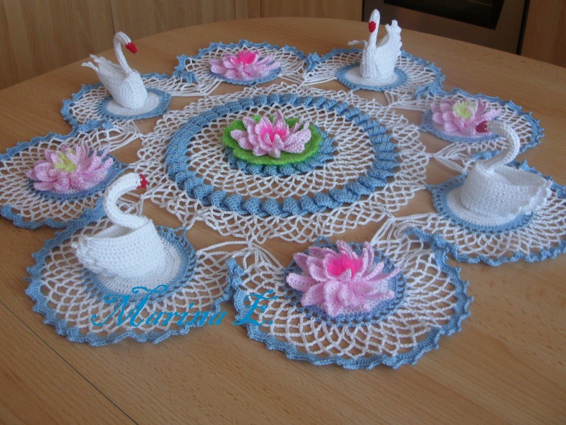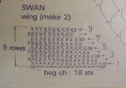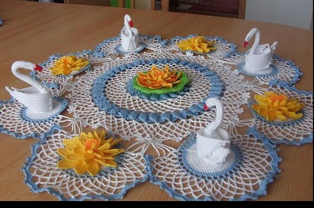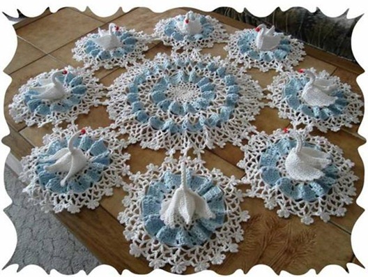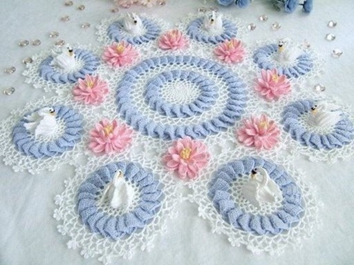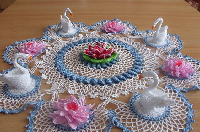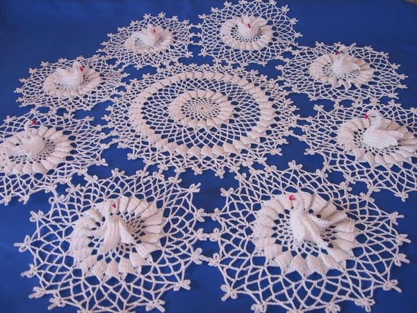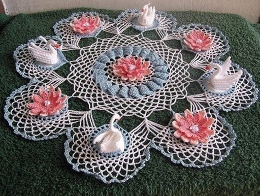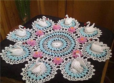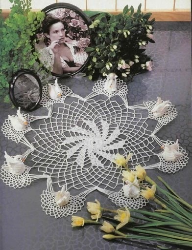 Так вяжем пять нижних частей лебедей и в процессе вязания последнего ряда обвязки прикрепляем их по кругу на одинаковом расстоянии друг от друга к центральной части салфетки из цветочного мотива. После этого вяжем по схеме: обвязываем четырьмя рядами арками из воздушных петель и в процессе вязания прикрепляемся к центральной части салфетки и в последнем, четвертом ряду соединяем между собой лебедей. Пико в четвертом ряду вяжем из пяти воздушных петель.
