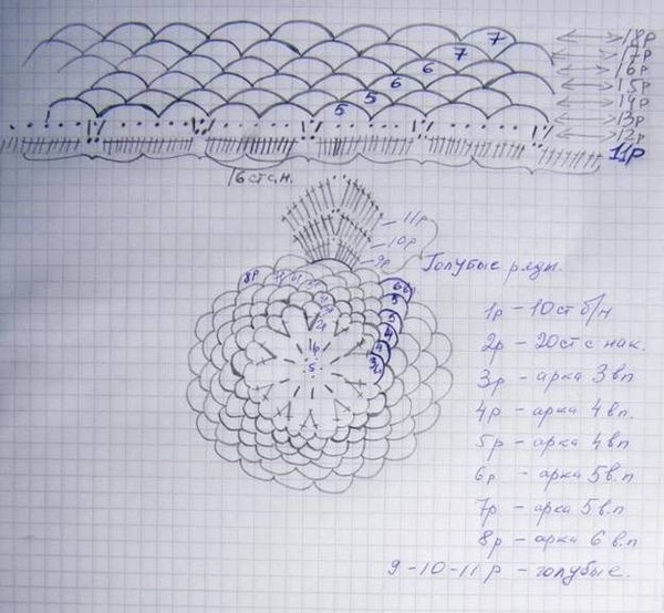 Цифрами на схеме указано количество воздушных петель арок. Пико в последнем обвязываемом ряду вяжется из пяти воздушных петель.