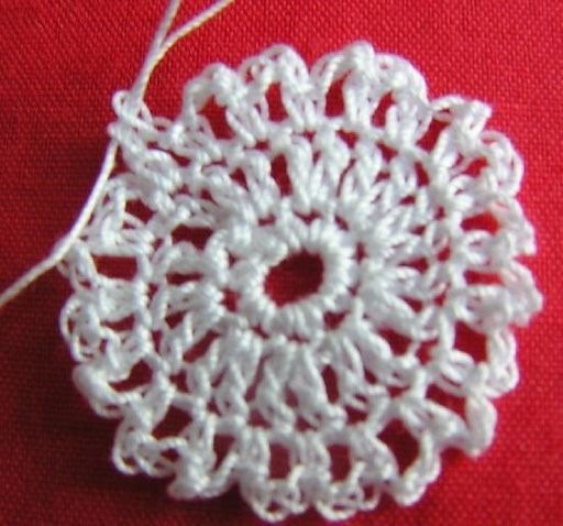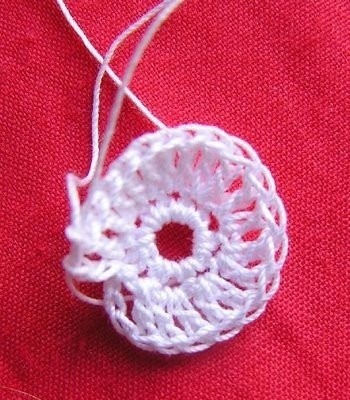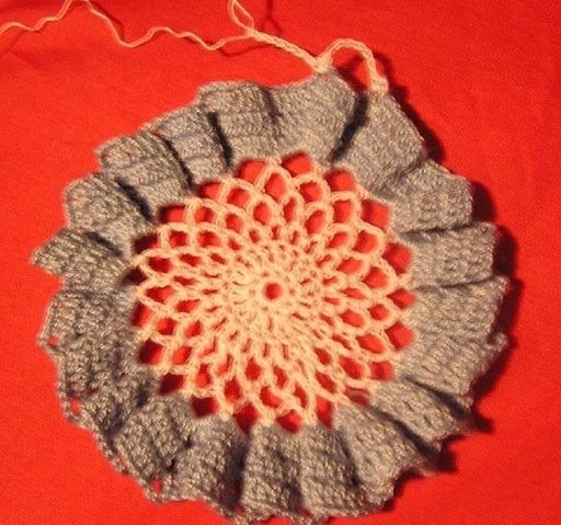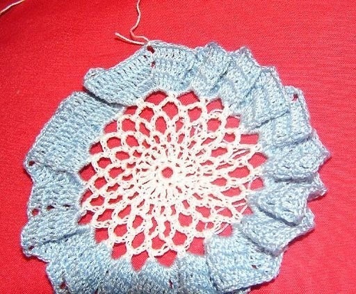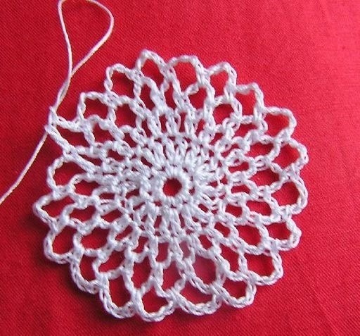 Вяжем пять лебедей столбиками без накида с прикреплением за заднюю часть косички. Сначала вяжем нижнюю часть лебедей, в виде выпуклого листочка. Набираем восемнадцать воздушных петель, делаем одну воздушную петлю для подъема и вяжем столбиками без накида в каждую петлю косички из цепочки воздушных петель. Когда довяжем до конца косички, то вяжем в последнюю петлю еще два столбика без накида для поворота и вяжем второй ряд , прикрепляясь за оставшуюся часть воздушной петли начального ряда. Потом вяжем по схеме, прикрепляя столбики за заднюю часть петель. Провязав все ряды нижней части лебедя, обвязываем листочек по кругу одним рядом по схеме, не забывая прикрепить его к нашему первому мотиву из цветочка.