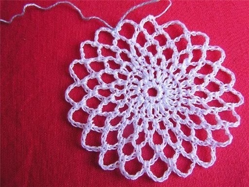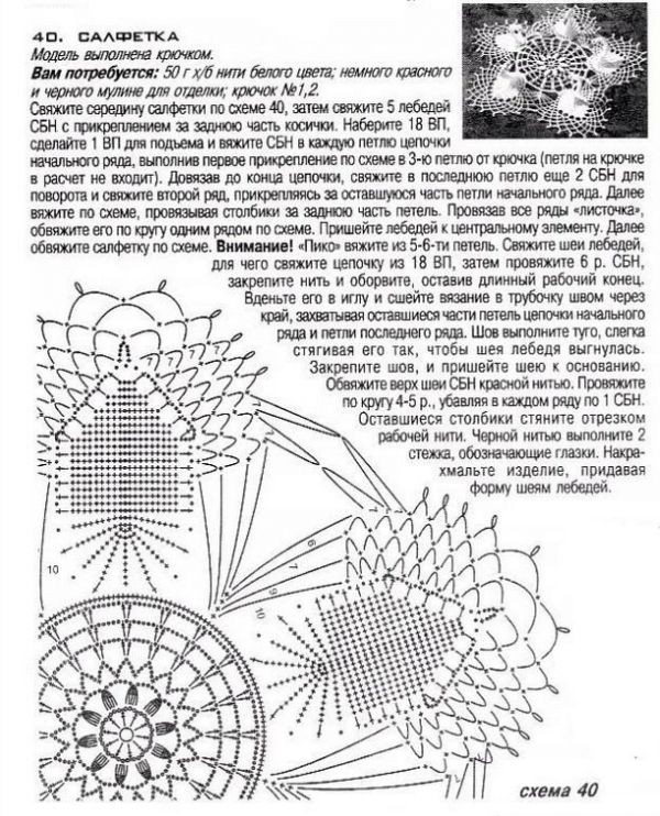 Сначала вяжем середину салфетки по схеме с мотивом из цветка, начиная с пяти воздушных петель, замкнутых в кольцо, отрезаем нить и прячем конец. Схема салфетки гуси- лебеди: