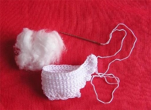 Вяжем шеи лебедей: для этого вяжем цепочку из восемнадцати воздушных петель, потом вяжем шесть рядов столбиками без накида, закрепляем и обрезаем нить, оставляя длинный конец рабочей нити. Вдеваем этот конец нити в иглу и сшиваем наше вязание в трубочку швом через край, захватывая петли последнего ряда и цепочки начального ряда. Шов делаем туго, немного стягивая его так, чтобы шея у лебедя выгнулась. Закрепляем шов и пришиваем шею к уже связанному основанию- нижней части лебедя.