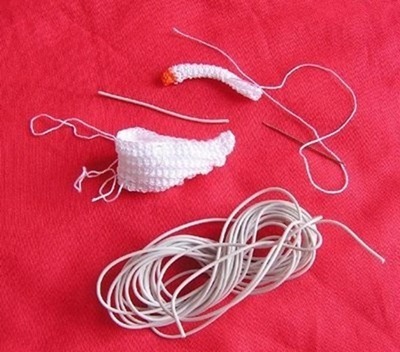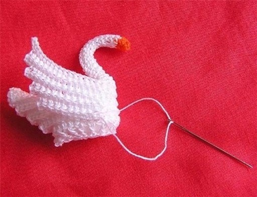 Клюв. Обвязываем верх шеи столбиками без накида нитью мулине красного цвета по кругу 4- 5 рядов, убавляя в каждом ряду по одному столбику без накида. Оставшиеся столбики стягиваем отрезком рабочей нити. Черной нитью мулине иглой делаем два стежка, которые обозначат глазки лебедя.