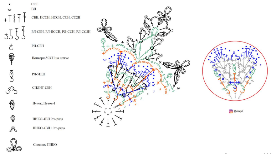 1 ВПП, СБН в арку, Пучок, Сложное ПИКО, Пучок, СБН, (РЛ-ССН, ПИКО-4ВП, РЛ-ССН), СБН, (РЛ-ПССН, ПИКО-4ВП, РЛ-ССН), СБН, (СБН, Пучок, ПИКО-4ВП, ССН, 3 ВП, Попкорн-5ССН на ножке, Сложное ПИКО, ССТ в Попкорн, 3 ВП, ССН, ПИКО-4ВП, Пучок-1, СБН), СБН, (РЛ-ССН, ПИКО-4ВП, РЛ-ПССН), СБН, (РЛ-ССН, ПИКО-4ВП, РЛ-ССН), СБН по кругу, повторить один раз. Соединить.