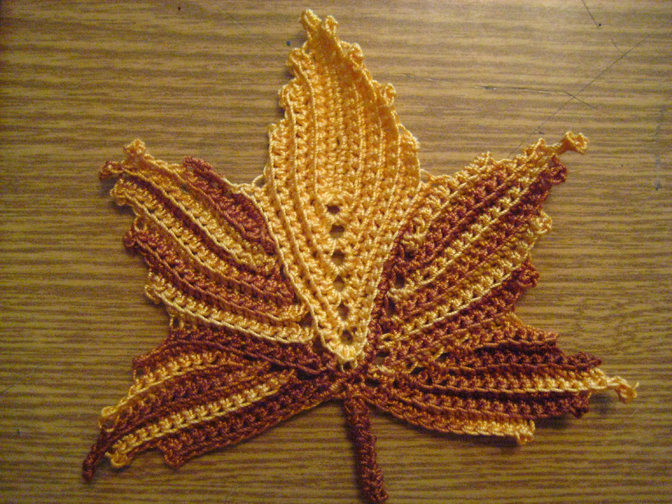 Закончив нижнюю часть, не отрывая нити обвязать одним рядом переход к верхнему правому ответвлению и связать эту часть листка.