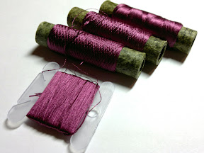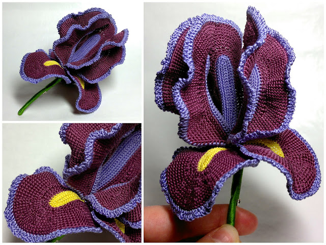 Ирис связан крючком 0,5 из тонких шелковых нитей в три сложения. Нитки с катушек удобно заранее перемотать на пластиковые бобины для мулине.