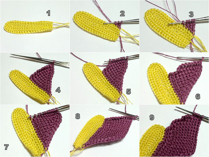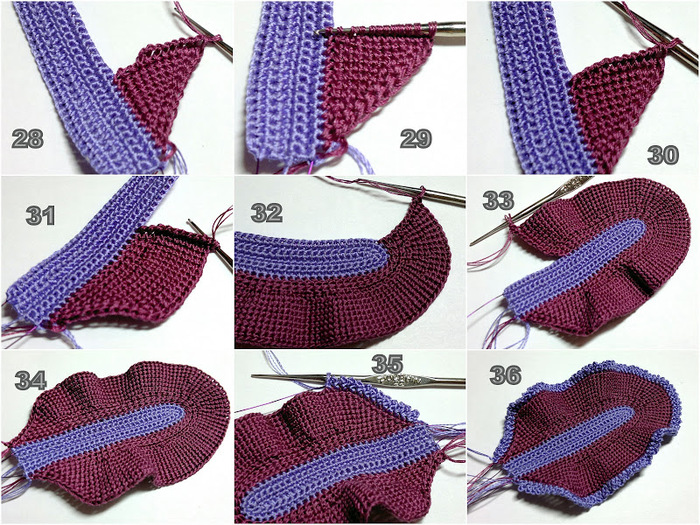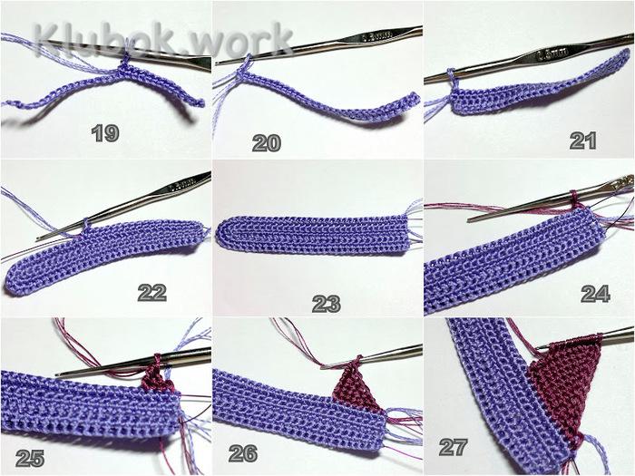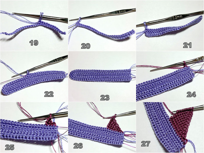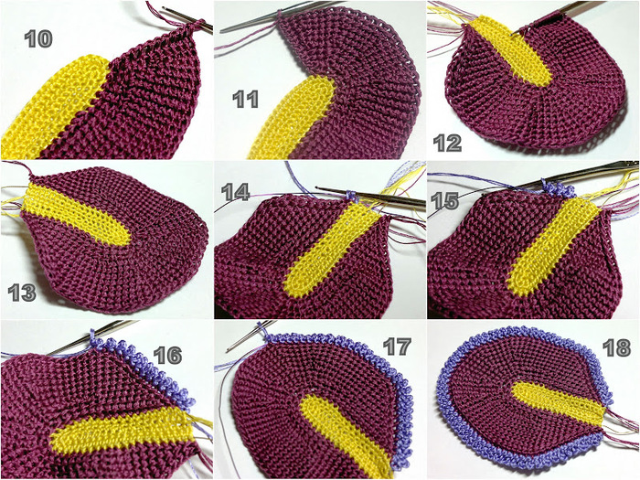 С торца вывязать 4 клина. Каждый клин вяжется следующим образов: укороченный ряд на 9 столбиков, затем укороченный ряд на 6 столбиков, затем на 3 столбика, на 6 столбиков, на 9 столбиков и, наконец, полный ряд (фото 9, 10). Левая часть лепестка вяжется симметрично. За 12 рядов до завершения в начале каждого наборного ряда делается убавка за счет вытягивания петли из двух тунисских столбиков одновременно. С лицевой стороны присоединить нить сиреневого цвета, приложить к краю лепестка проволоку и обвязать деталь пико (фото 15-18).