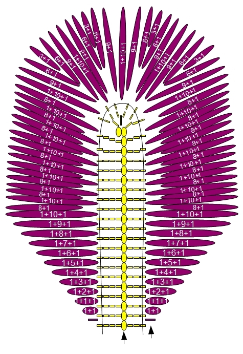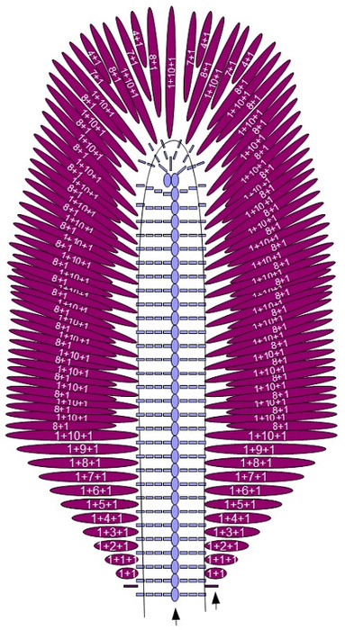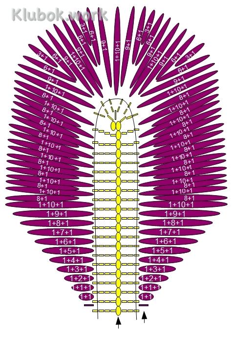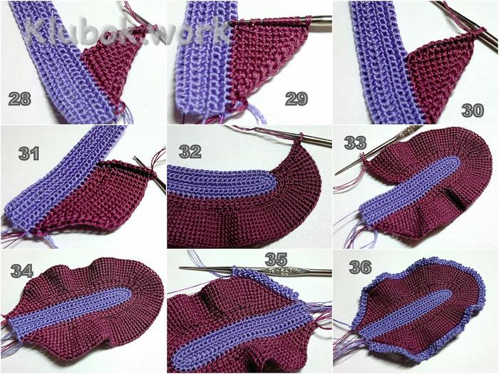 Для внутреннего лепестка сиреневой нитью набрать 32 вп. В остальном он вяжется аналогично внешнему. Несколько иначе выполняются клинья: ориентируйтесь по схеме