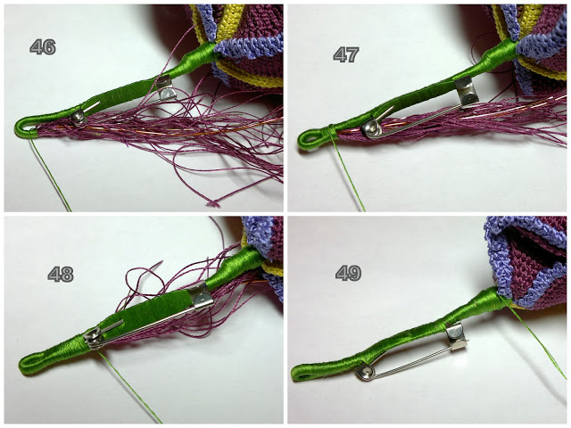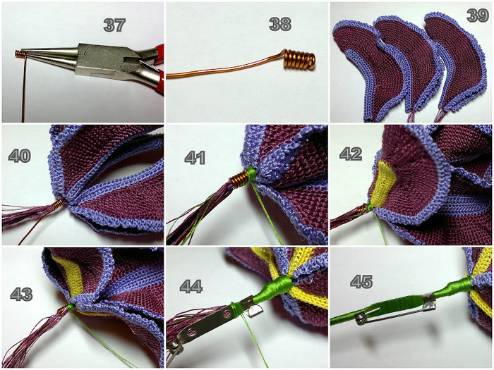 Для основы стебля взять 15 см толстой проволоки, на конце скрутить спираль с внутренним диаметром примерно равным толщине всех проволочных и нитяных концов, идущих от трех внутренних лепестков (фото 37, 38). Продеть эти проволочки/ниточки внутрь спирали (фото 40). Лепестки расположить лицевой стороной наружу. Зелёной нить начать обматывать стебель (фото 41). По одному прикрепить внешние лепестки (фото 42, 43), основу для броши (фото 44, 45).