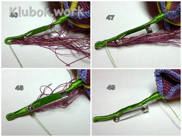 На уровне полутора-двух сантиметров после застёжки согнуть стебель, сформировав петельку, и продолжить обмотку в обратном направлении. Добравшись до основания лепестков, заделать нить.