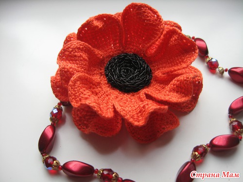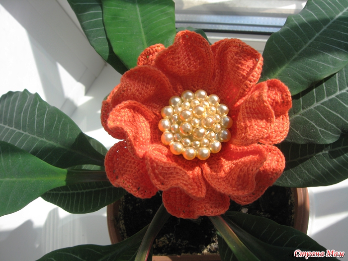 Оранжевый цветок обвязан простыми столбиками без накида, но вместе с проволочкой. Поэтому лепестки можем уложить, как нам захочется.