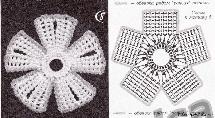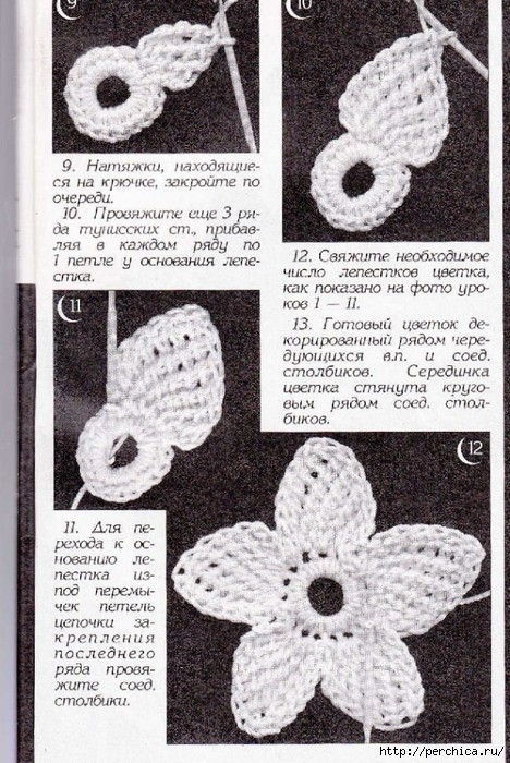 Между лепестками промежутка нет. Для лепестка набрать 8 вп; провязать ряд из 8 тунисских столбиков (кромочную вытянуть из первой петли основы); укороченный ряд из 4 тунисских столбиков; провязать два ряда из 8 тунисских столбиков (кромочные вытянуть из второй петли основы); укороченный ряд из 4 тунисских столбиков; ряд из 8 тунисских столбиков (кромочную вытянуть из третьей петли основы) и т. д.; закрыть ряд соединительными столбиками. Готовый цветок обвязать рачьим шагом.