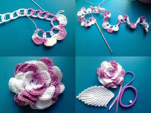 цветокKlubokhttp://klubok.work/2/199/7317/Klubokhttps://klubok.work/css/image/top-logo-en.pngНаберите начальную цепочку из 40 воздушных петель + 3 возд. петли подъема. 1-й ряд вяжите через одну петлю цепочки, из следующей петли провязывая 2 ст.с/н, разделенных одной возд. петлей. 2-й ряд начните с 3-х возд. петель подъема, из каждой арочки между столбиками вяжите 2 ст. с/н, 3 возд.п., 2 ст с/н. 3-й ряд: 3 возд. петли подъема, из каждой арочки между столбиками вяжите веер из 3 ст. с/н. Закончив ряд, закрепите и обрежьте нить. Из связанной ленты–спирали уже можно формировать цветок, но вначале необходимо украсить его красивой обвязкой. Присоедините к началу ряда нить другого цвета и вяжите по краю из каждой петли соединительный столбик и воздушную петлю. Обвязка соединительными столбиками с чередованием их воздушными петлями делает край декоративным и немного волнистым. Сделав обвязку, скрутите вязаную ленту в спираль, сформировав цветок, снизу сшейте его основание, таким образом закрепив его форму.
