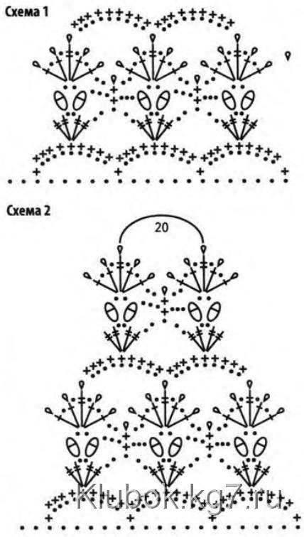 Наберите цепочку из возд. п. = обхвату кисти + 2-3 см для свободного прилегания. Далее вяжите по схеме 2.