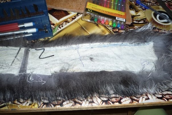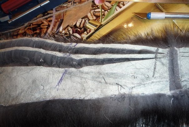 Мех расчертить на полосочки около 0,5 см, нарезать его. (я резала ножом для работы с деревом, он очень тонкий и ОЧЕНЬ острый,можно резать канцелярским ножом. Осортировать по качеству. Так как у меня был сшитый воротник, то в нем попадались различного качества мех, тот что получше в одну кучку, остальное в другую (пригодиться).