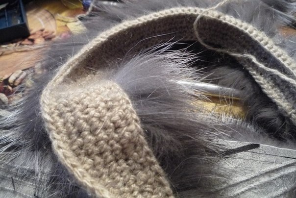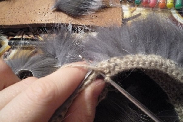 2 ряд начинаем привязывать мех, мездрой прикладываем к вязанию и вяжем столбик без накида, при этом вводим крючок в петлю и сзади между меха около мездры, захватываем нитку и провязываем обычный столбик без накида, далее вяжем столбик без накида без меха, и так чередуем столбик с мехом и 1 или 2 без меха.