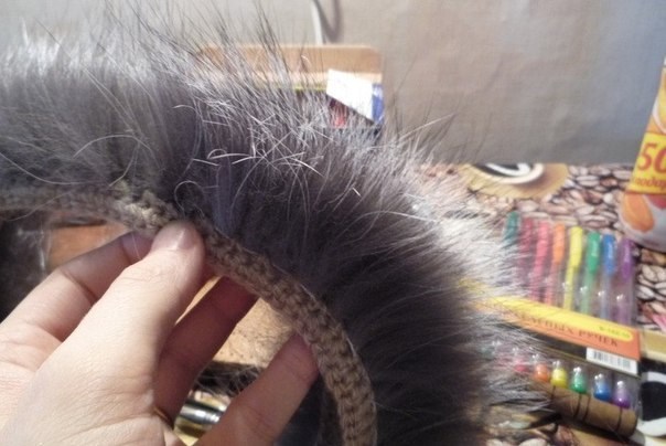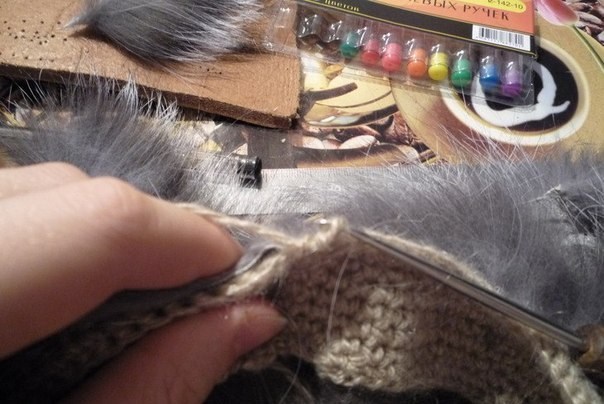 Меховые полосочки я сшивала по ходу вязания, чтобы меховая нить не была длиной. При этом важно соблюдать направление меха, сшивала простой ниткой с иголкой.
