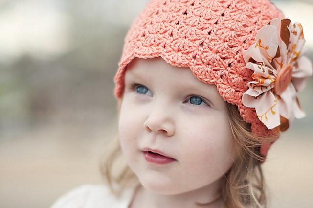 Шапка вяжется от макушки вниз, донышко вяжется из простых столбиков с накидом, затем вяжется узор из ракушек.