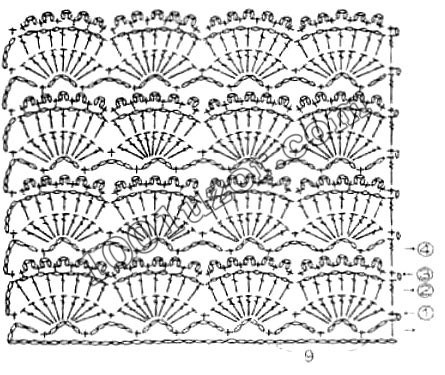 Ряд 9: СС в арку из 1 в.п. первой рогатки, 3 в.п., 2 СН в эту же арку, СБН в след. рогатку, * 5 СН в след. рогатку, СБН в след. рогатку; повторять от * до конца ряда, 2 СН в ту же рогатку, куда вязались начальные 3 в.п.; СС в верхнюю в.п. из начальных 3 в.п.: 20 ракушек и 20 СБН.