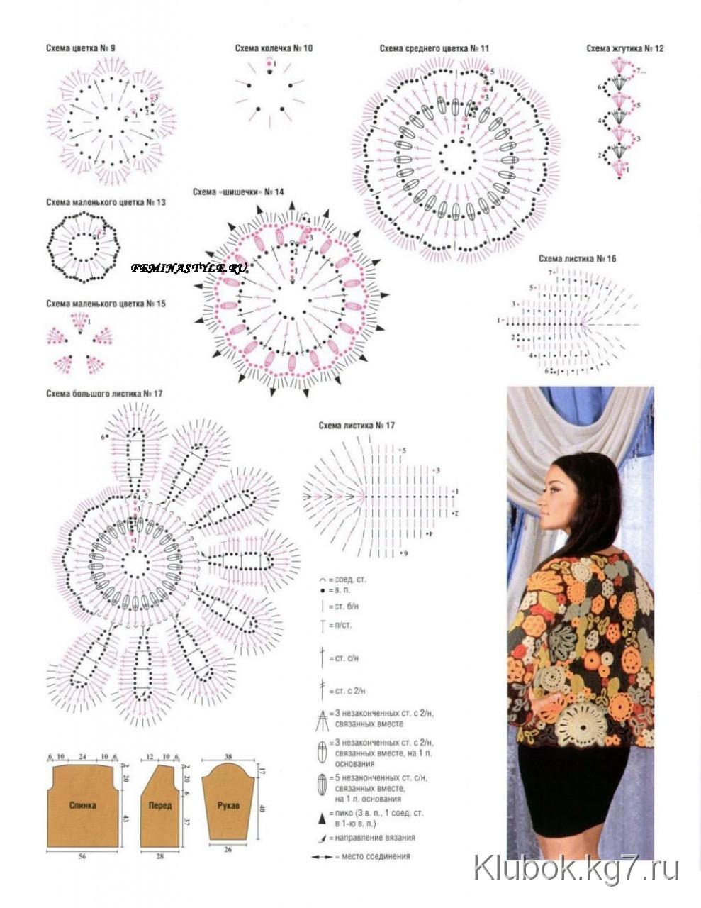 Этот женственный жакет, выполненный крючком из разнообразных мотивов, (можно увеличить) отлично подойдет к строгой черной юбке и будет уместен как на работе, так и на торжестве.