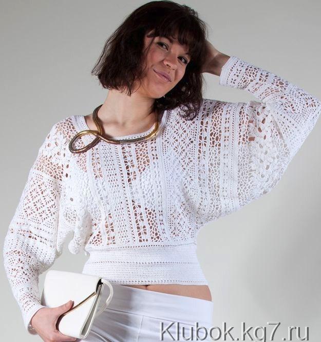 Связать цепочку из 70 воздушных петель, вязать прямоугольное полотно выстой 13 см (манжета рукава). Затем делаем прибавки в конце и начале каждого ряда по 2 петли для рукавов. Вязать по выкройке 39 см. Затем вязать 14 см прямо. В месте расположения горловины перед и спинку вязать отдельно. А дальше по выкройке в зеркальном отражении.