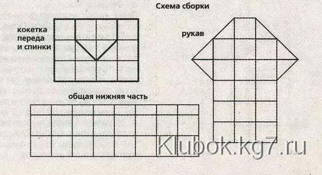 Common lower part: connect 16 squares and 8 simple half squares. Sew the finished pieces together and finish with 1 row of single crochet. Edge of the cut should be finished with the pattern from scheme 4, and the neckline, bottom of the item, and bottom of the sleeves with the pattern from scheme 5. Knit a cord of length 130 cm and thread it at the connection of the yokes and the common lower part of the item.