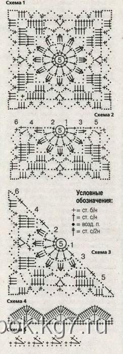 You need to knit 88 squares according to scheme 1, 8 half squares according to scheme 2, 8 diagonal half squares according to scheme 3. The squares are joined during the knitting of the last row.