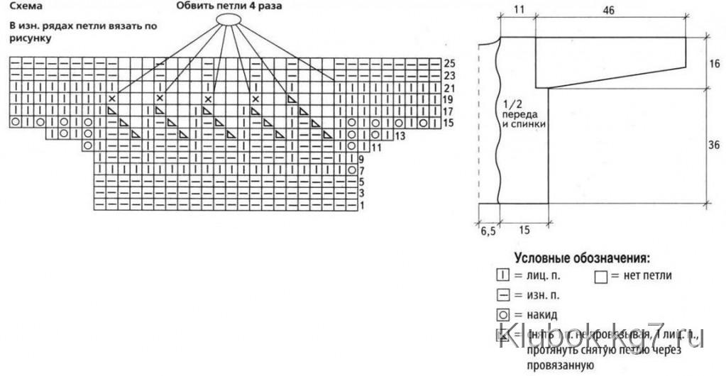 Front: knit in the transverse direction. Cast on 86 sts, knit the pattern according to the scheme. Then knit 4 rows in purl stitch. Next, knit in stockinette stitch. At a height of 4 cm from the pattern for the armhole, bind off 26 sts. After that, knit another 4 cm straight and bind off the stitches. Knit the other front symmetrically.