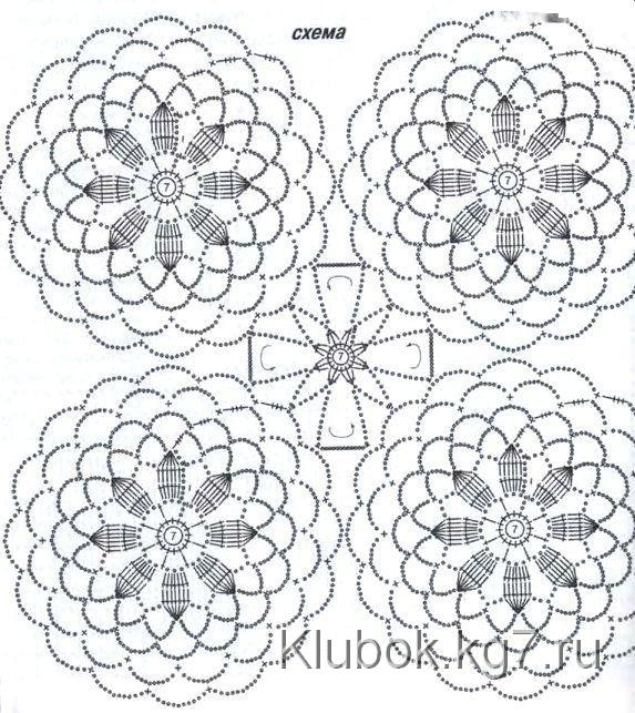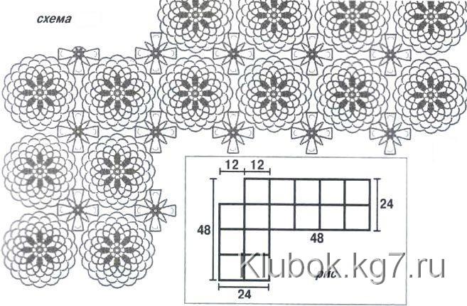 The model is made from separate motifs according to the pattern, with each motif measuring 12x12 cm. Small connecting motifs need to be crocheted between the main motifs and connected during the knitting process according to the pattern. The finished item should be edged with a row of single crochet stitches and a row of crab stitches.